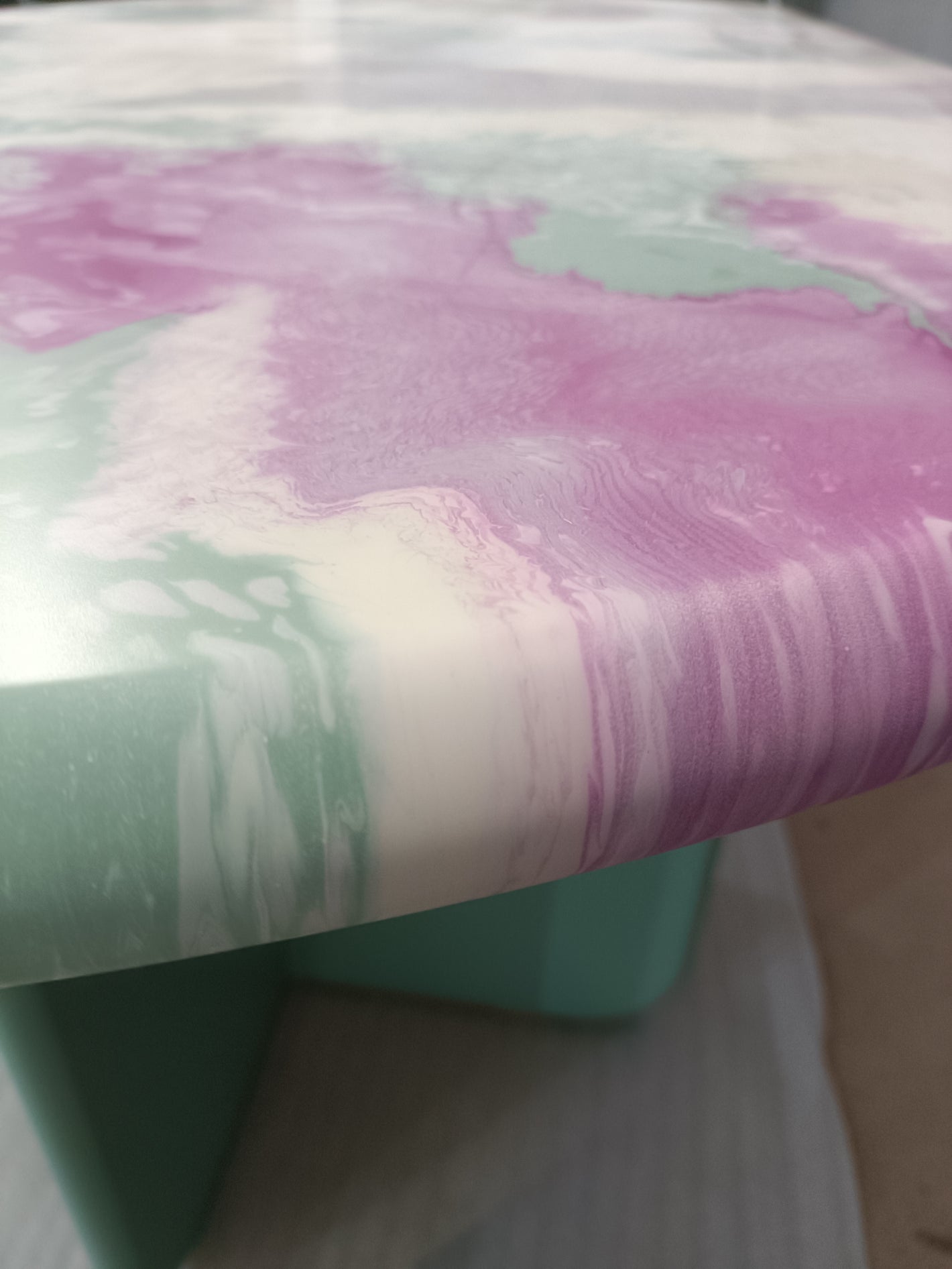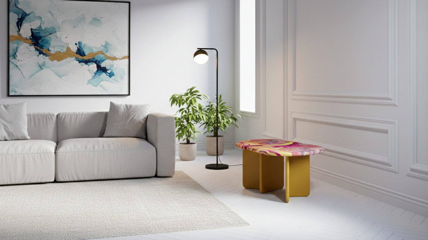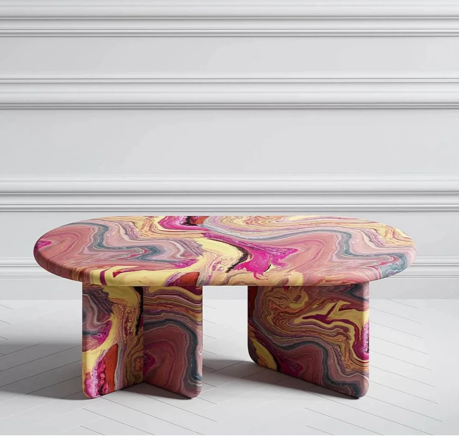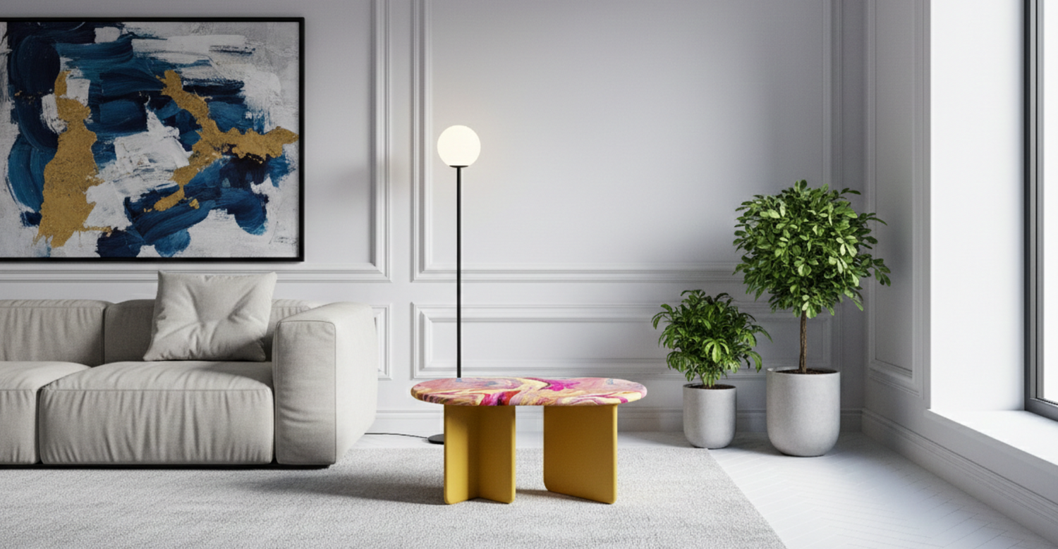 Each table is unique. The exclusive paint application technology ensures that the surface pattern cannot be reproduced, giving every piece an individual character. Customers can choose from a curated colour palette, including classic ink tones and vibrant contemporary shades, allowing seamless integration into any interior while preserving the original artistic concept.