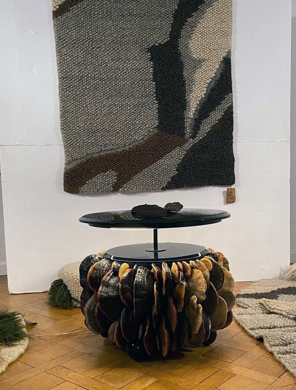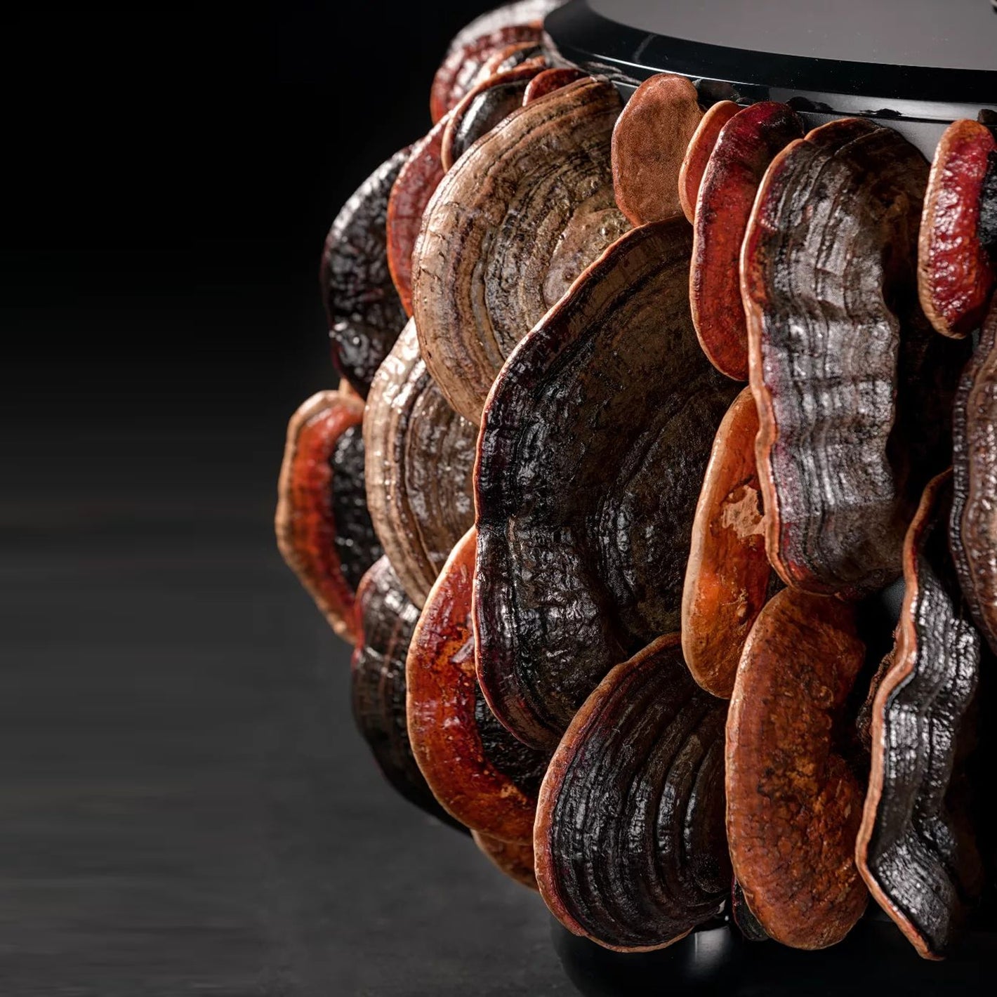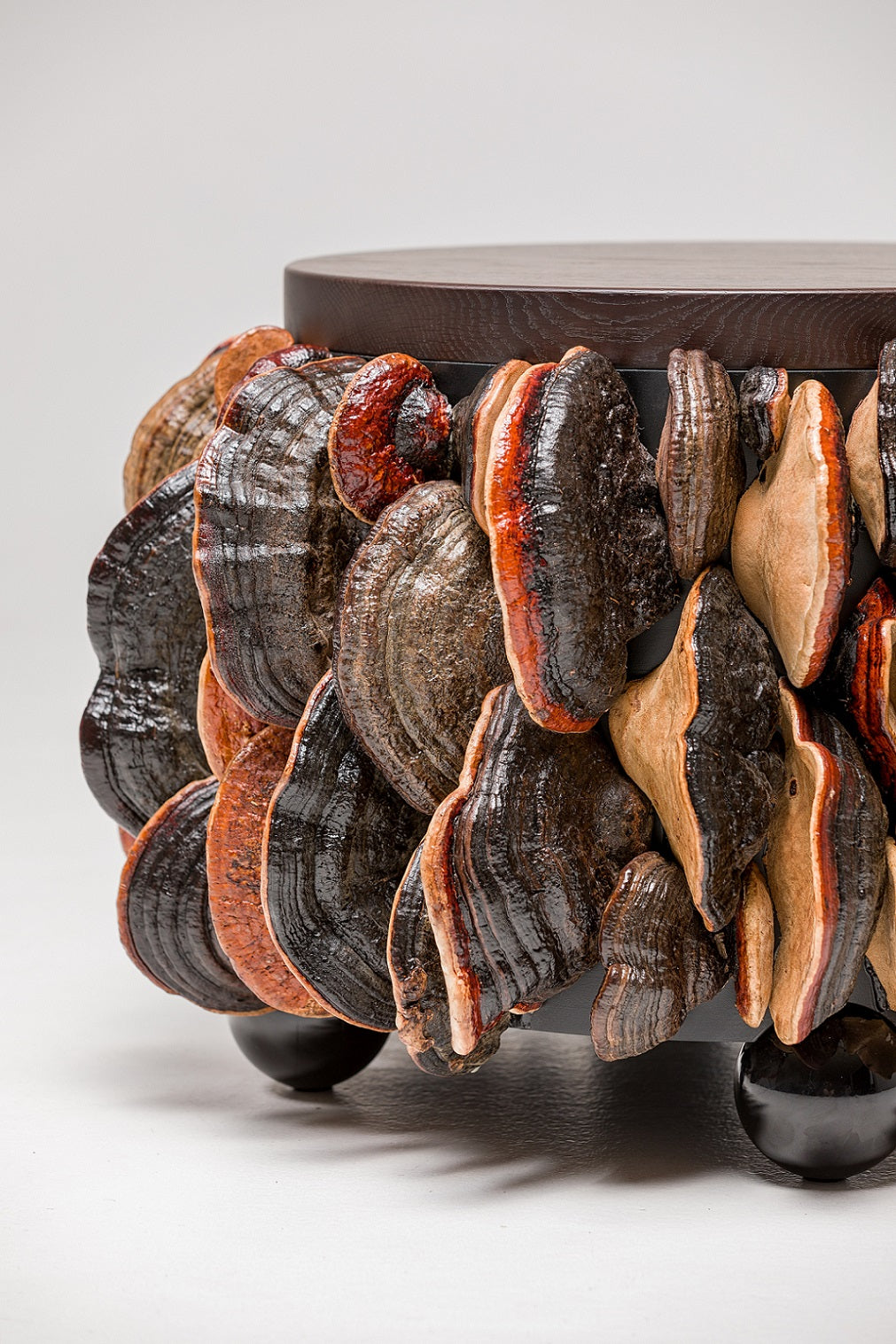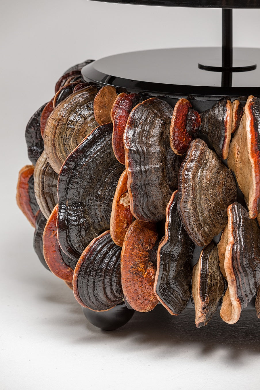 Crafted with meticulous attention to detail, the table features a blend of metal, plywood, and genuine wood polypore mushrooms. This unconventional combination results in a striking visual aesthetic that seamlessly marries the natural and the futuristic.