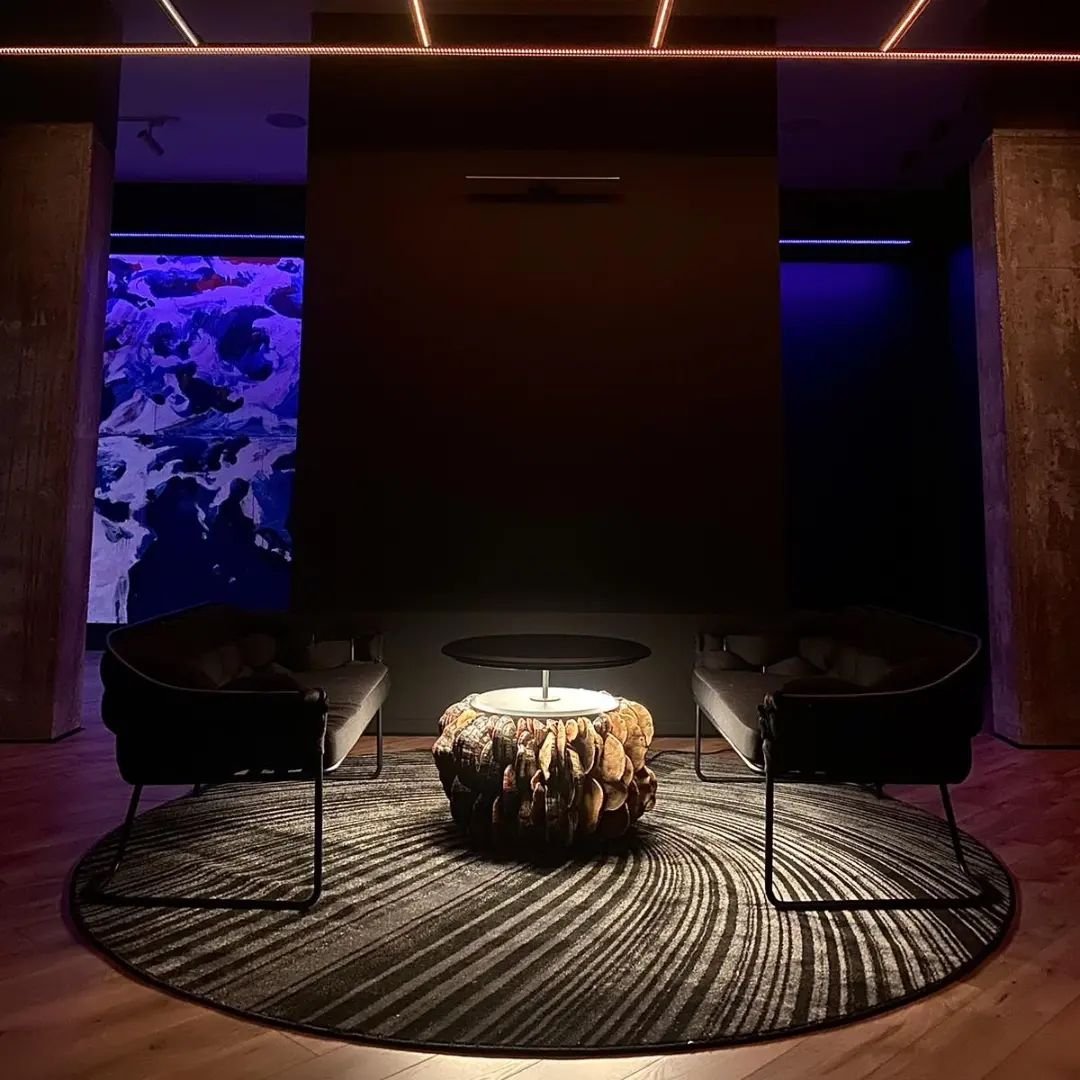 The table's unique round shape, sleek black tabletop varnish, and enchanting illumination conjure an aura reminiscent of an otherworldly being. It's as if this table has journeyed from a distant planet, where the boundaries of design and imagination know no bounds.