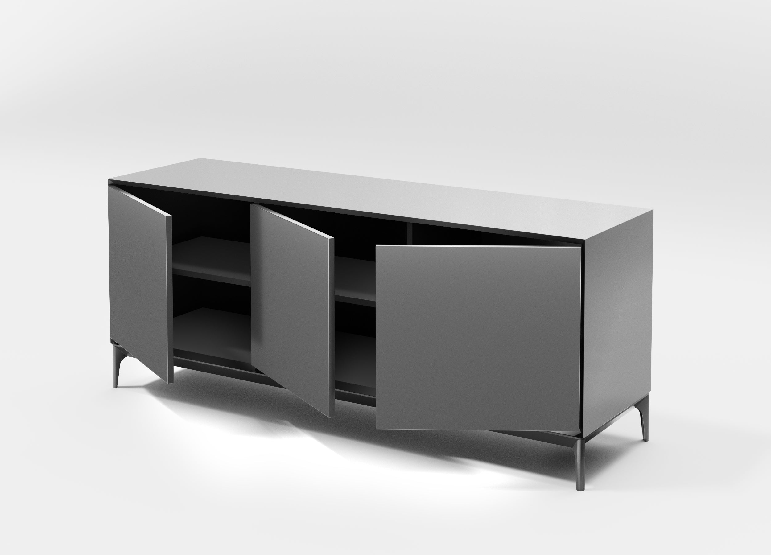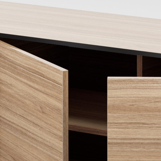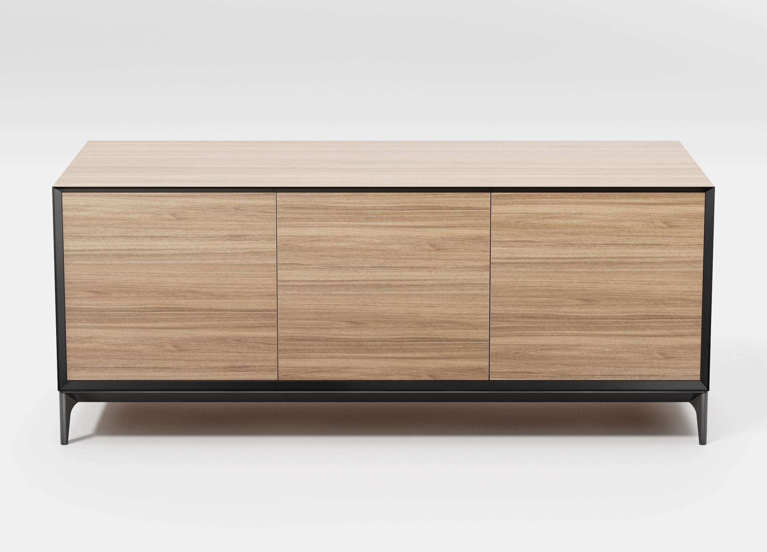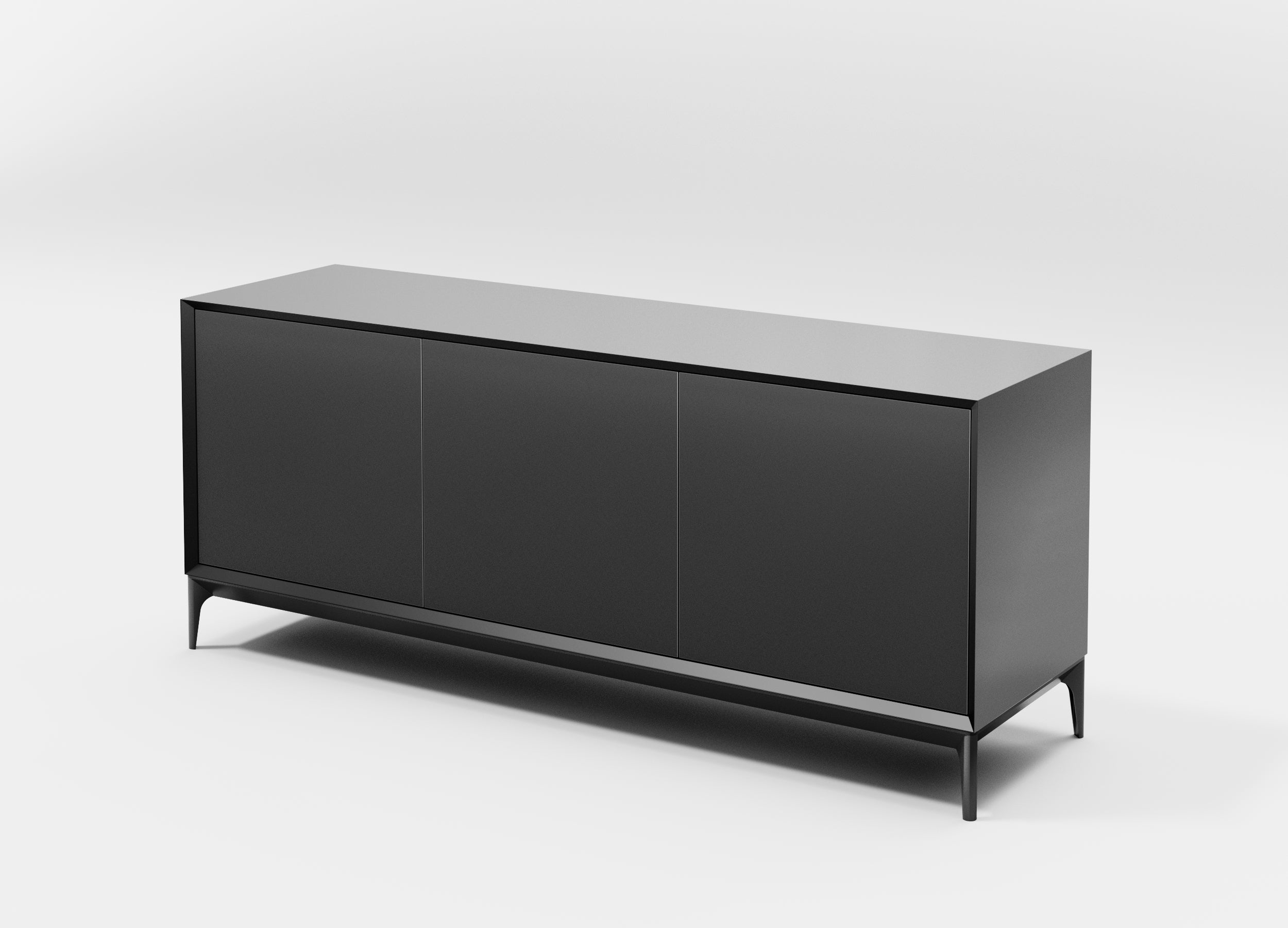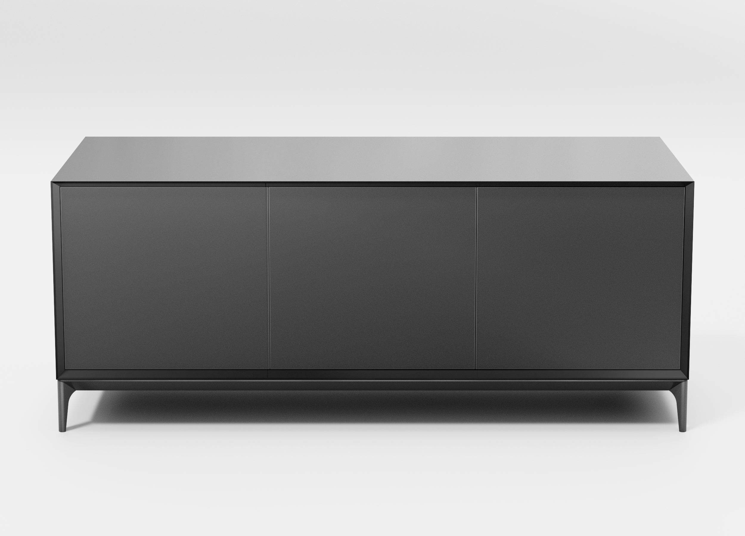 The TV Stand Delta 2 features a black front edge paired with sturdy aluminium legs, creating a unique and eye-catching silhouette. With three spacious compartments for storage and organisation, it offers a stylish and functional addition to your space.