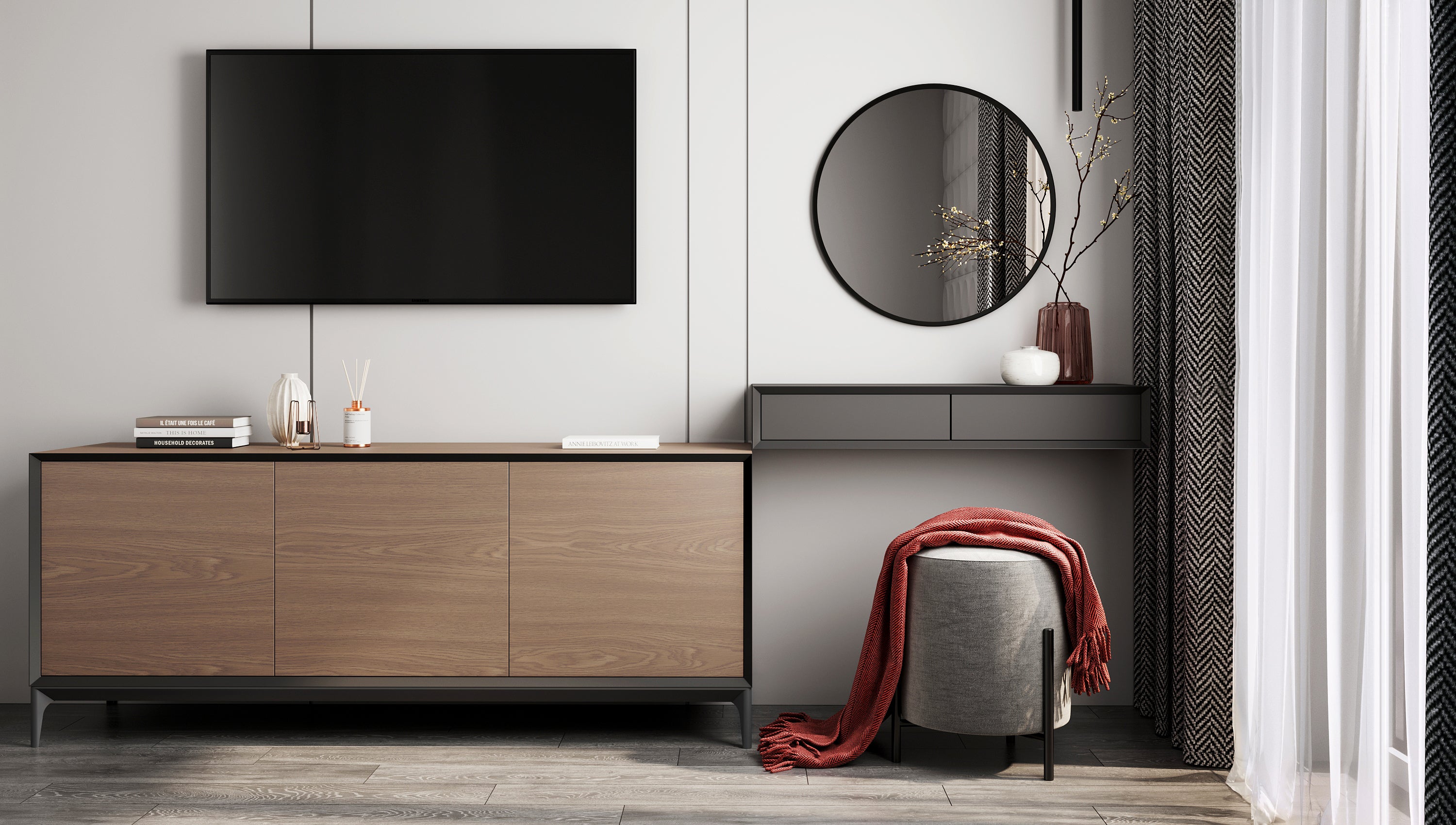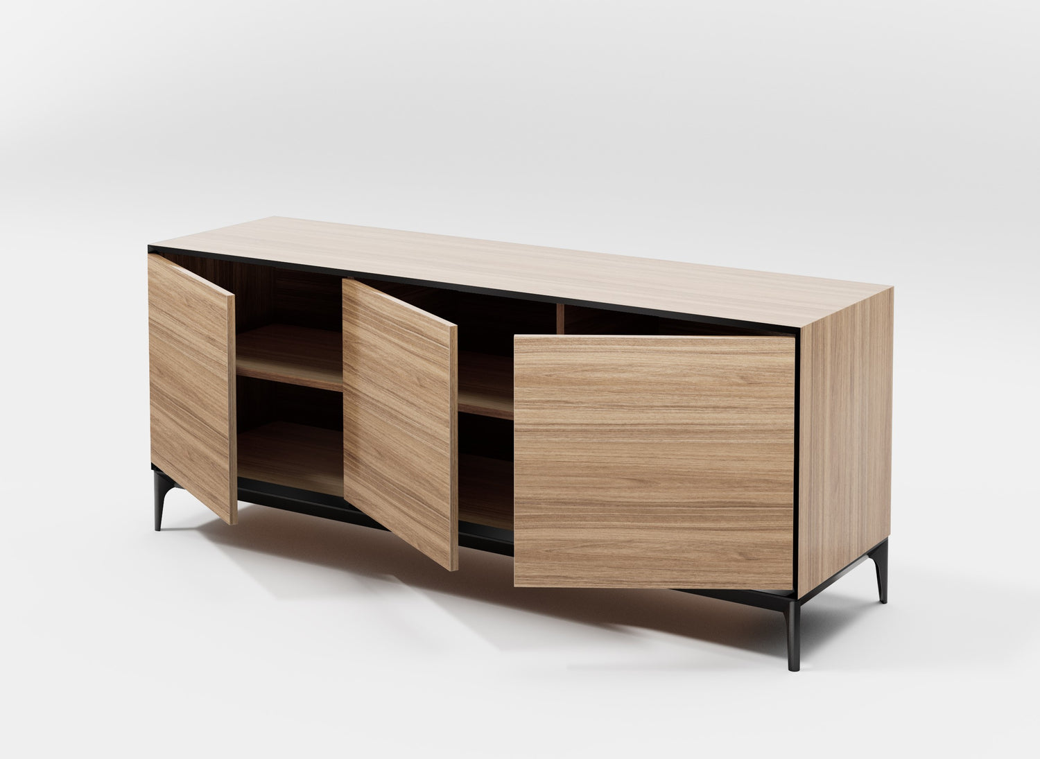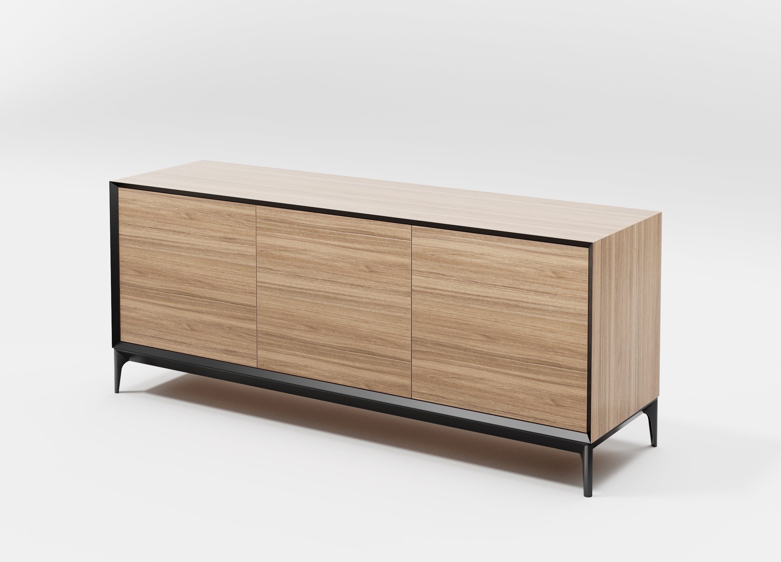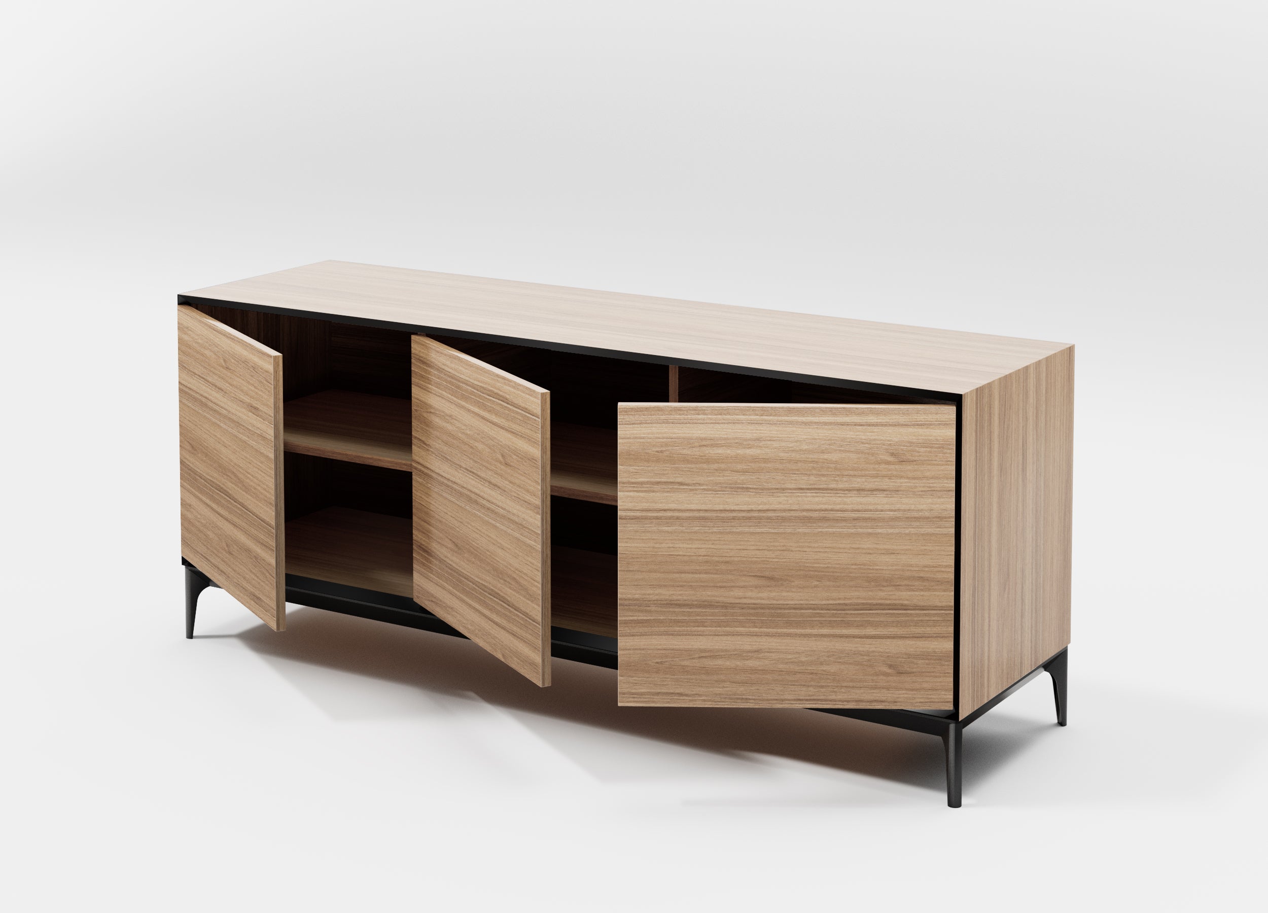 The TV Stand Delta 2 features a black front edge paired with sturdy aluminium legs, creating a unique and eye-catching silhouette. With three spacious compartments for storage and organisation, it offers a stylish and functional addition to your space.