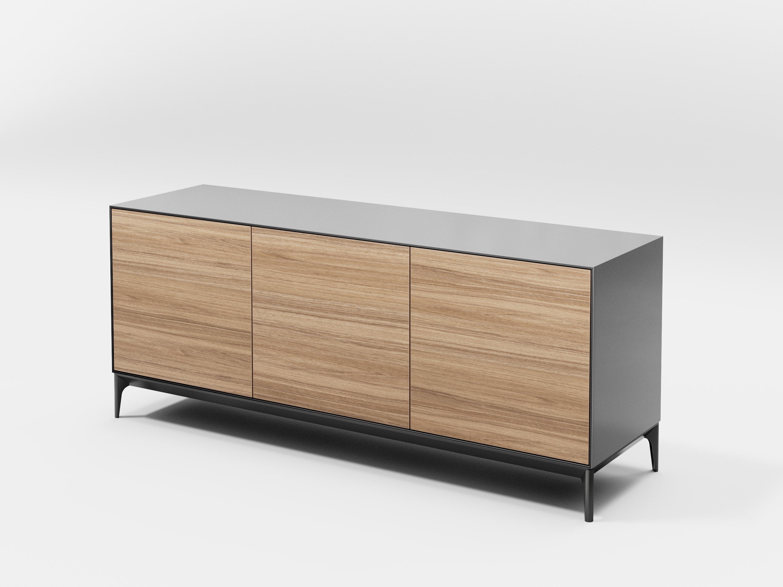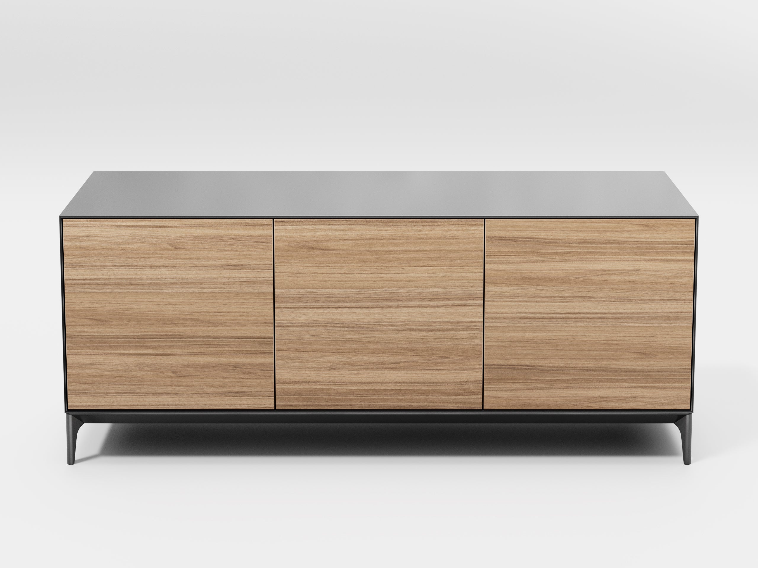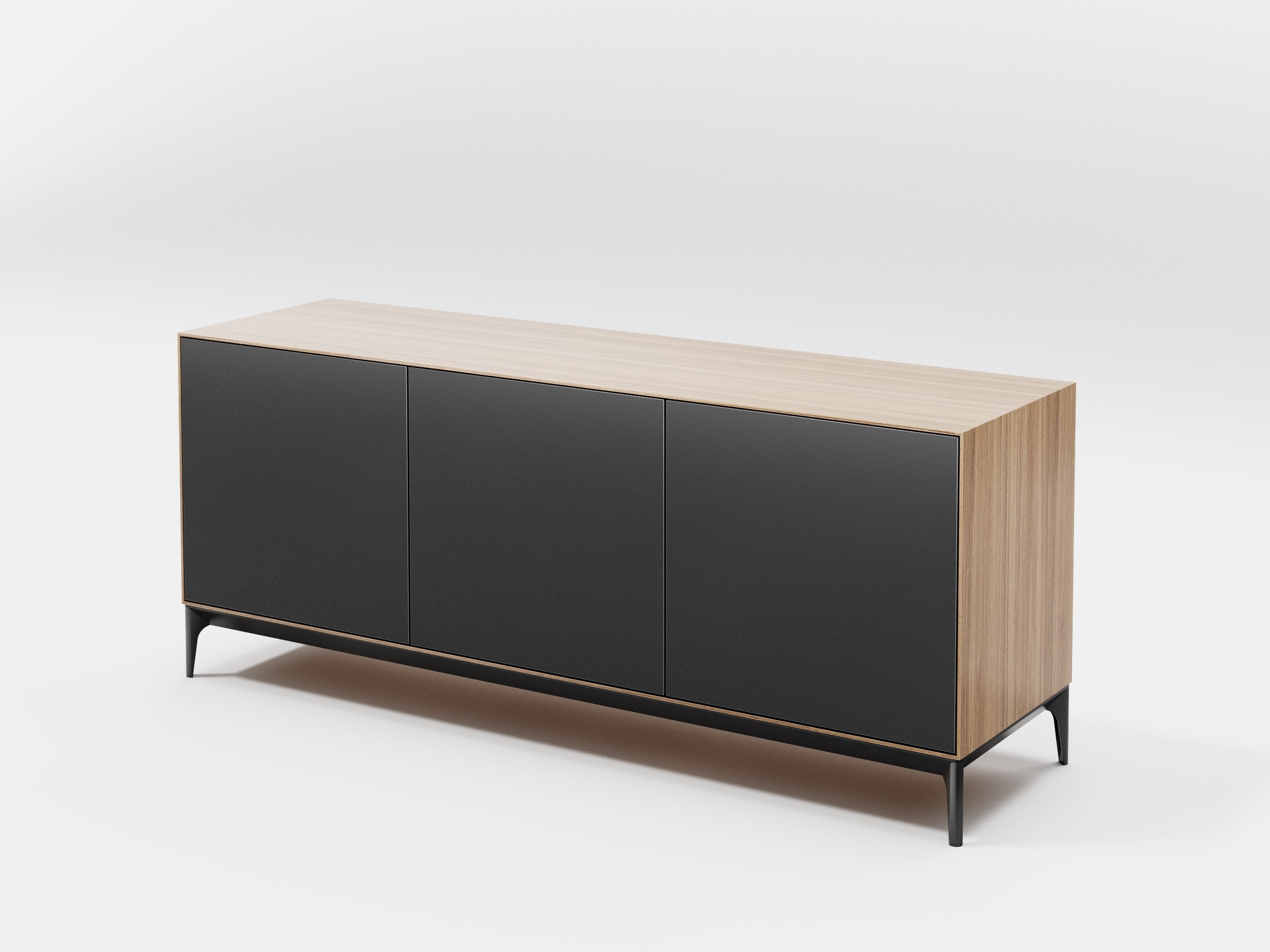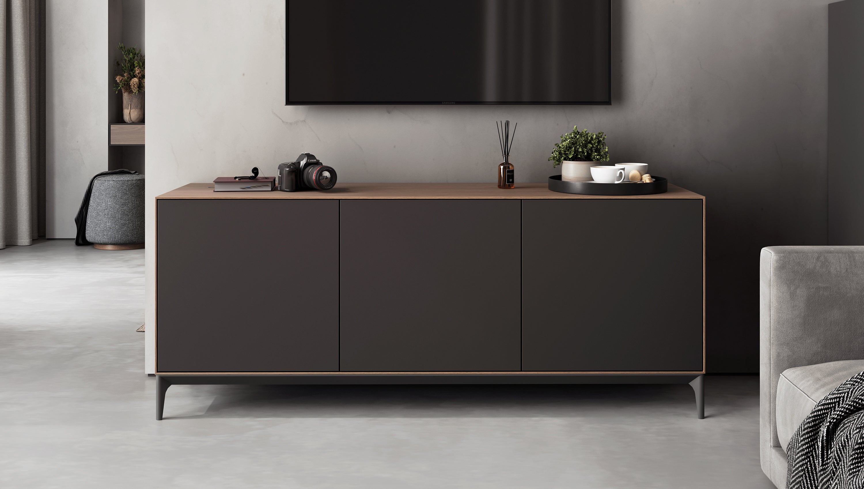 The Gamma 2 TV stand combines two colours and sleek aluminium legs, resulting in a perfect design. The unit offers three spacious compartments for storing your belongings, while the elevated legs create a sense of lightness, avoiding any feeling of bulkiness.