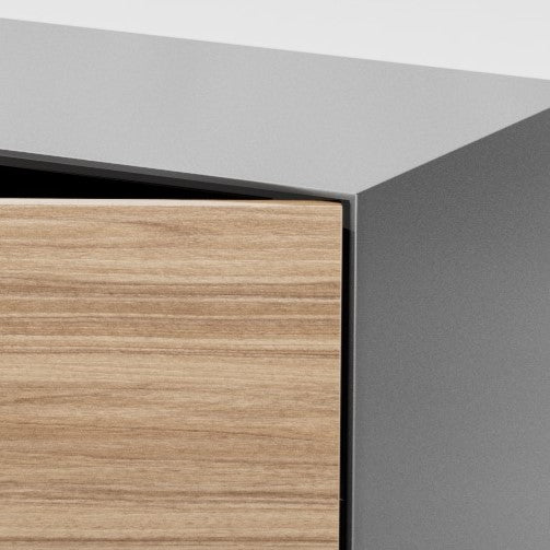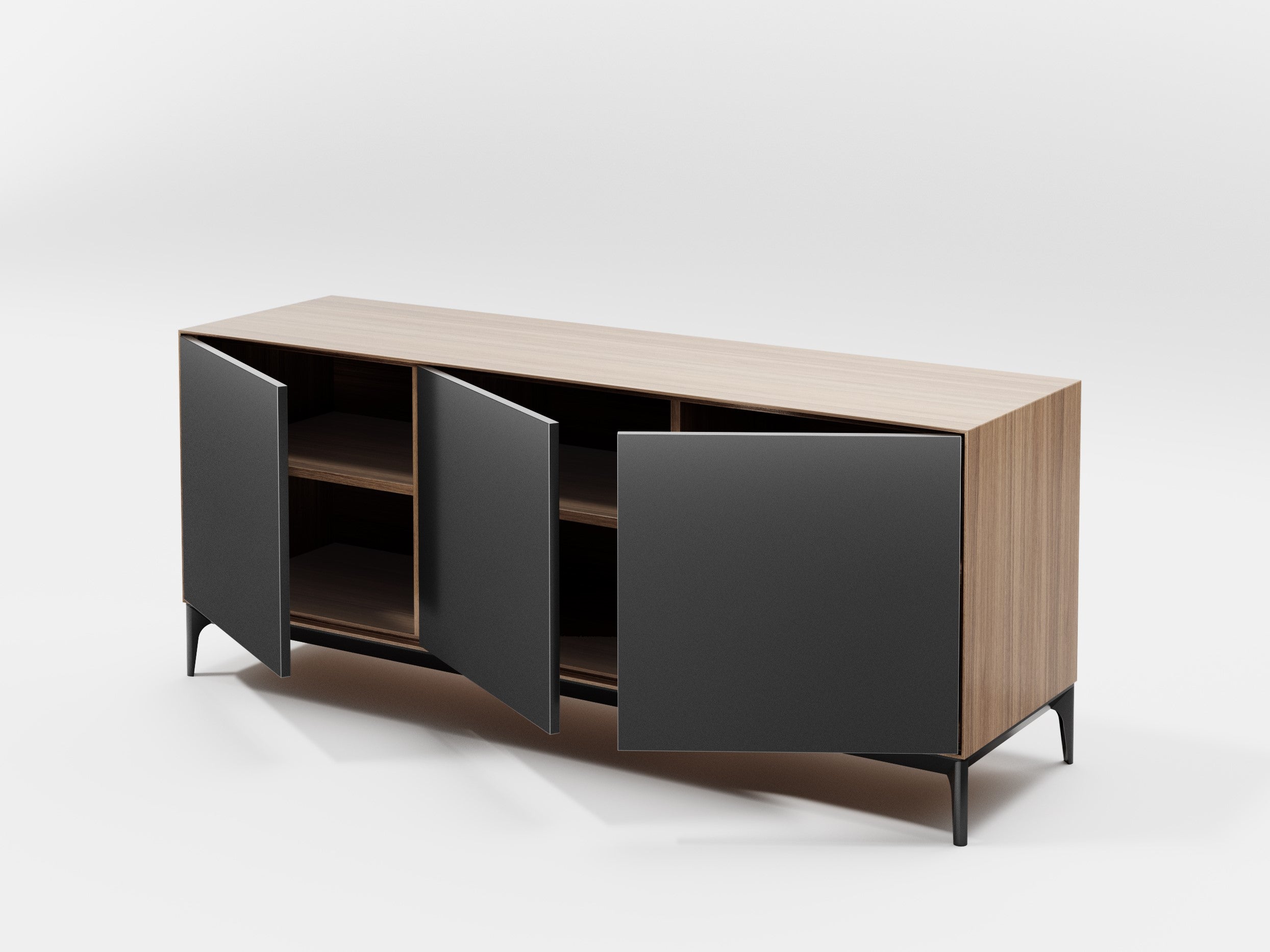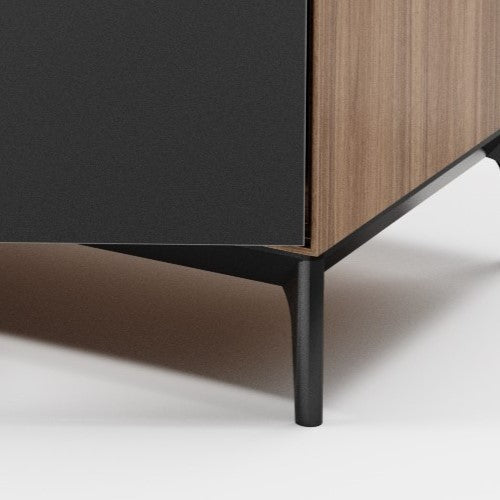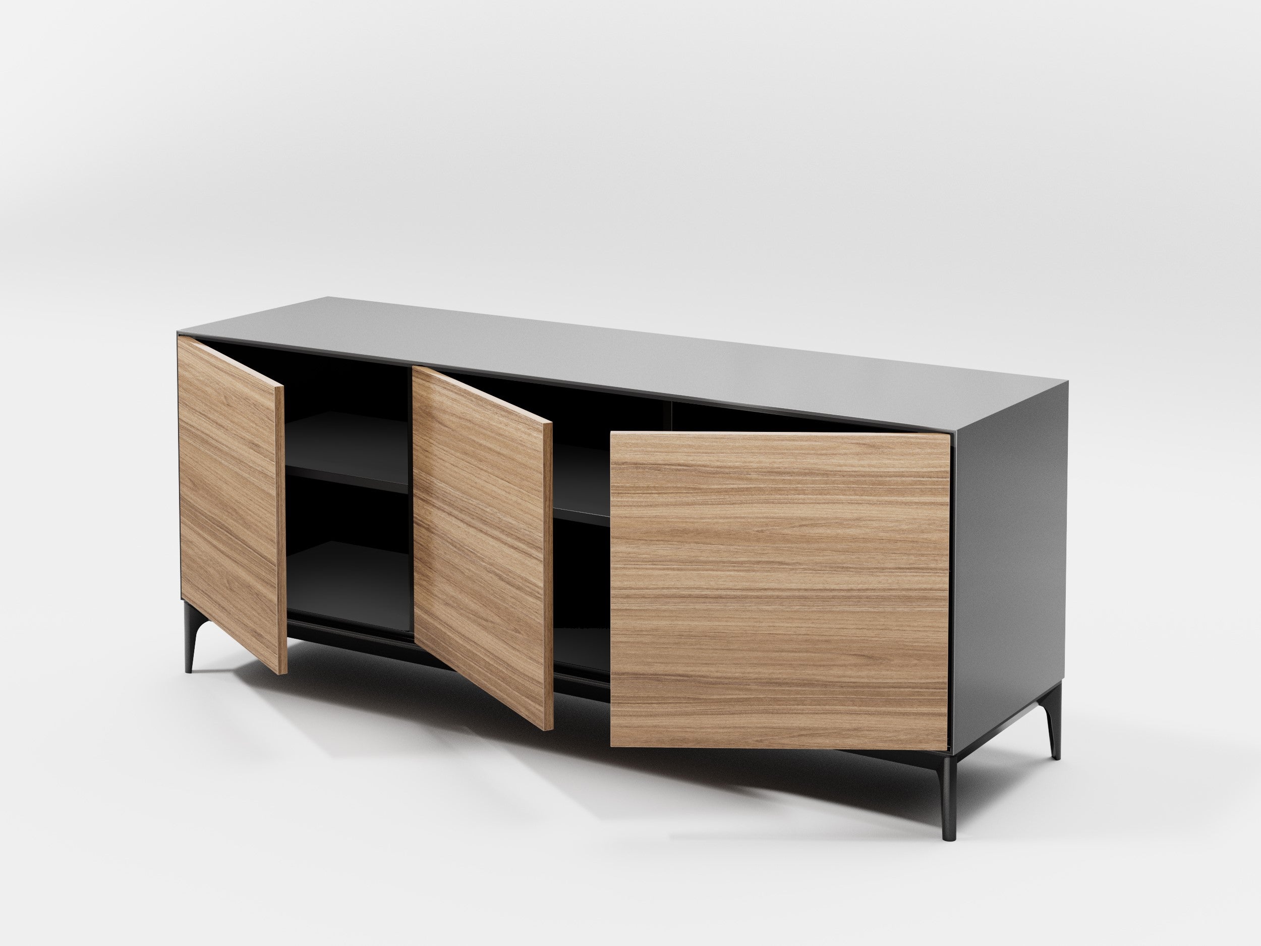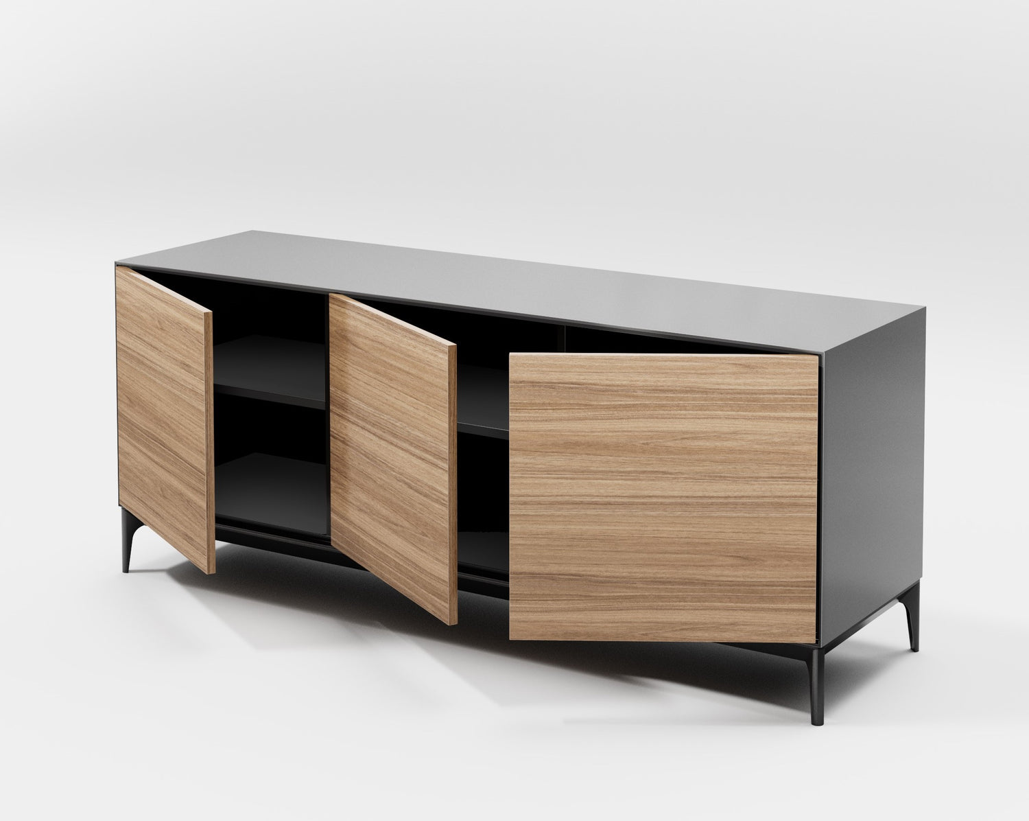 The Gamma 2 TV stand combines two colours and sleek aluminium legs, resulting in a perfect design. The unit offers three spacious compartments for storing your belongings, while the elevated legs create a sense of lightness, avoiding any feeling of bulkiness.