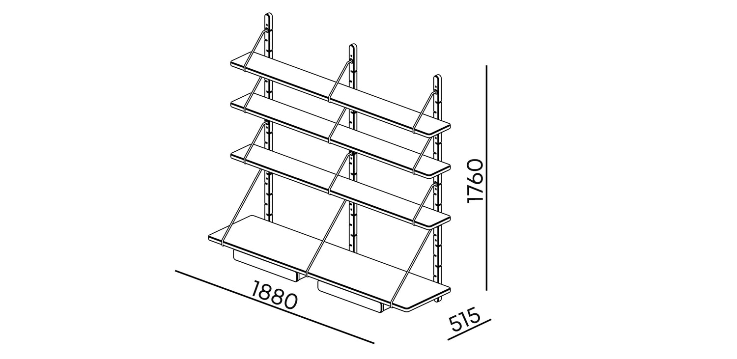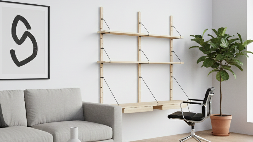 A dedicated bracket fixing system allows the shelves to be positioned freely along the height of the vertical guides, supporting flexible configuration and practical storage planning. Upon request, the TWIG M4 can be produced with a reduced number of shelves. The TWIG M4 Shelving system also incorporates a compact integrated work table with two drawers, expanding its use beyond storage to support light working, writing or organisational tasks.