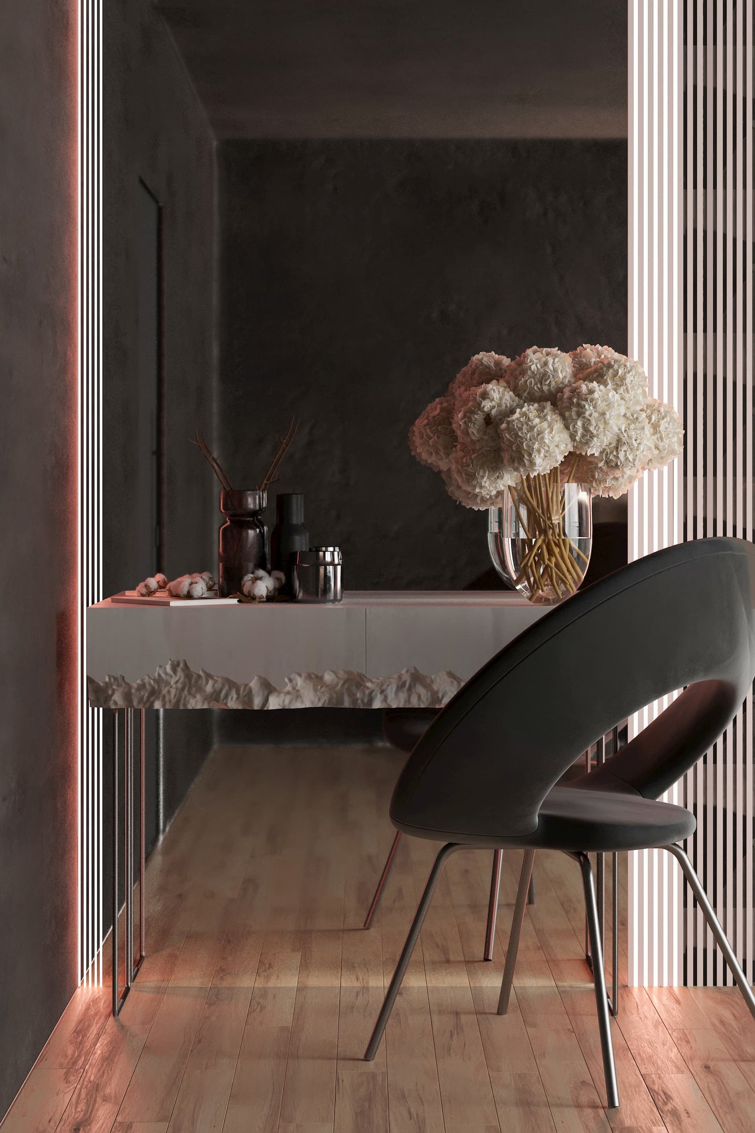What sets the BREAKFREE Vanity Table apart is its unique design that marries strength with delicacy. The rough, glacier-like texture of the tabletop stands in awe-inspiring contrast to the slender metal legs that support it. This harmonious interplay of textures creates an aura of balance, making the table appear both substantial and weightless in your space.