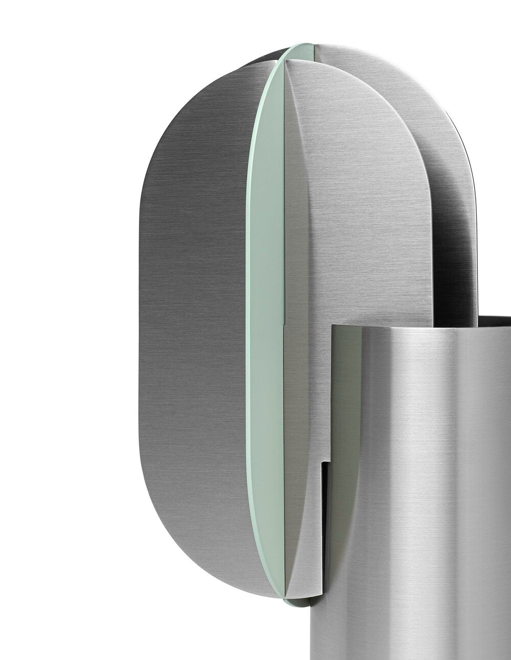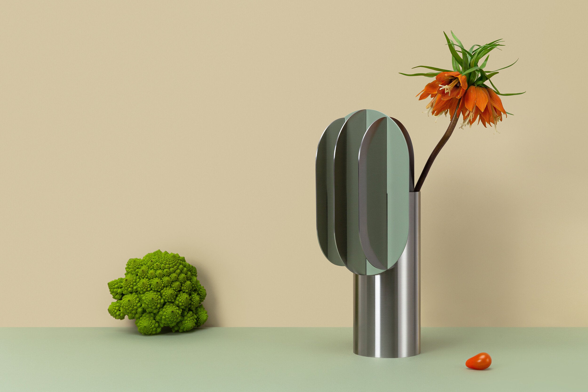 The composition of Gabo Vase CS11 with Delaunay Vase CS11 attracts the eye with its brilliant simplicity and its palette of delicate green and cream colours combined with stainless steel, which create a calm and, at the same time, modern vibe in the interior.