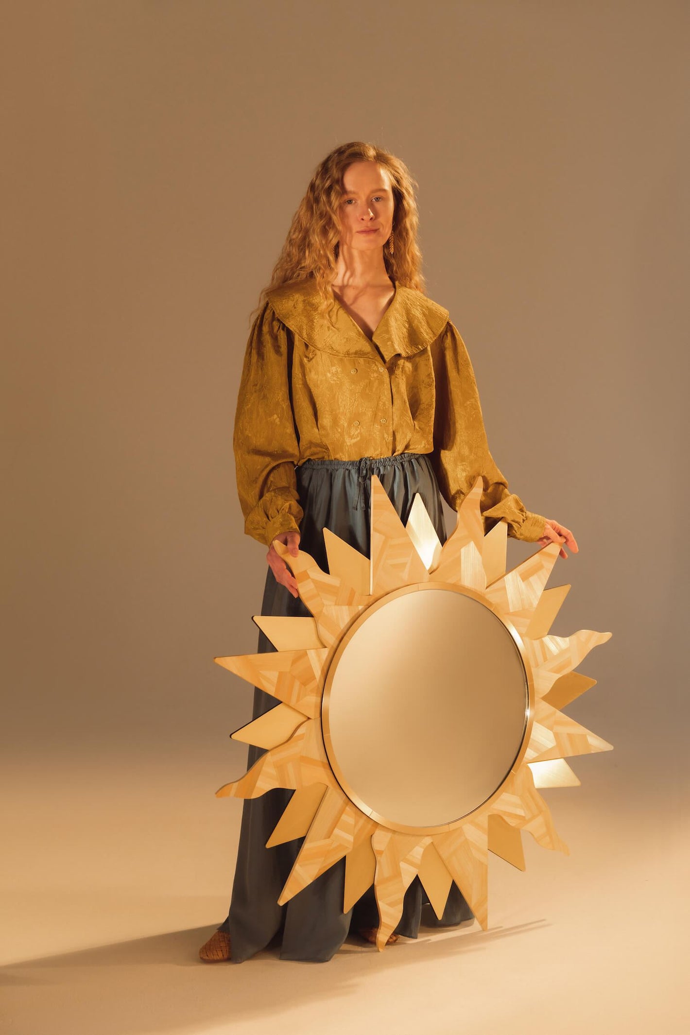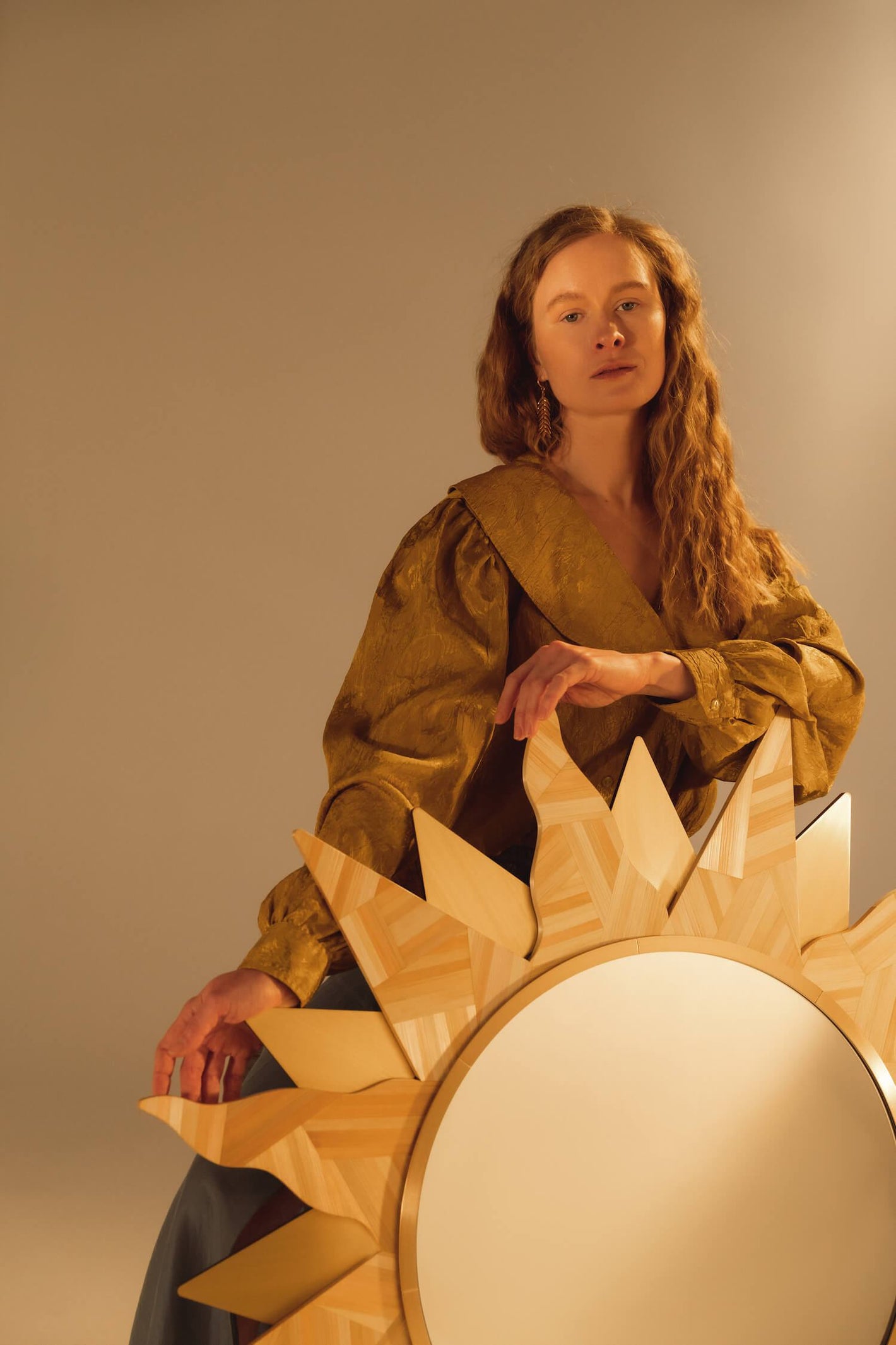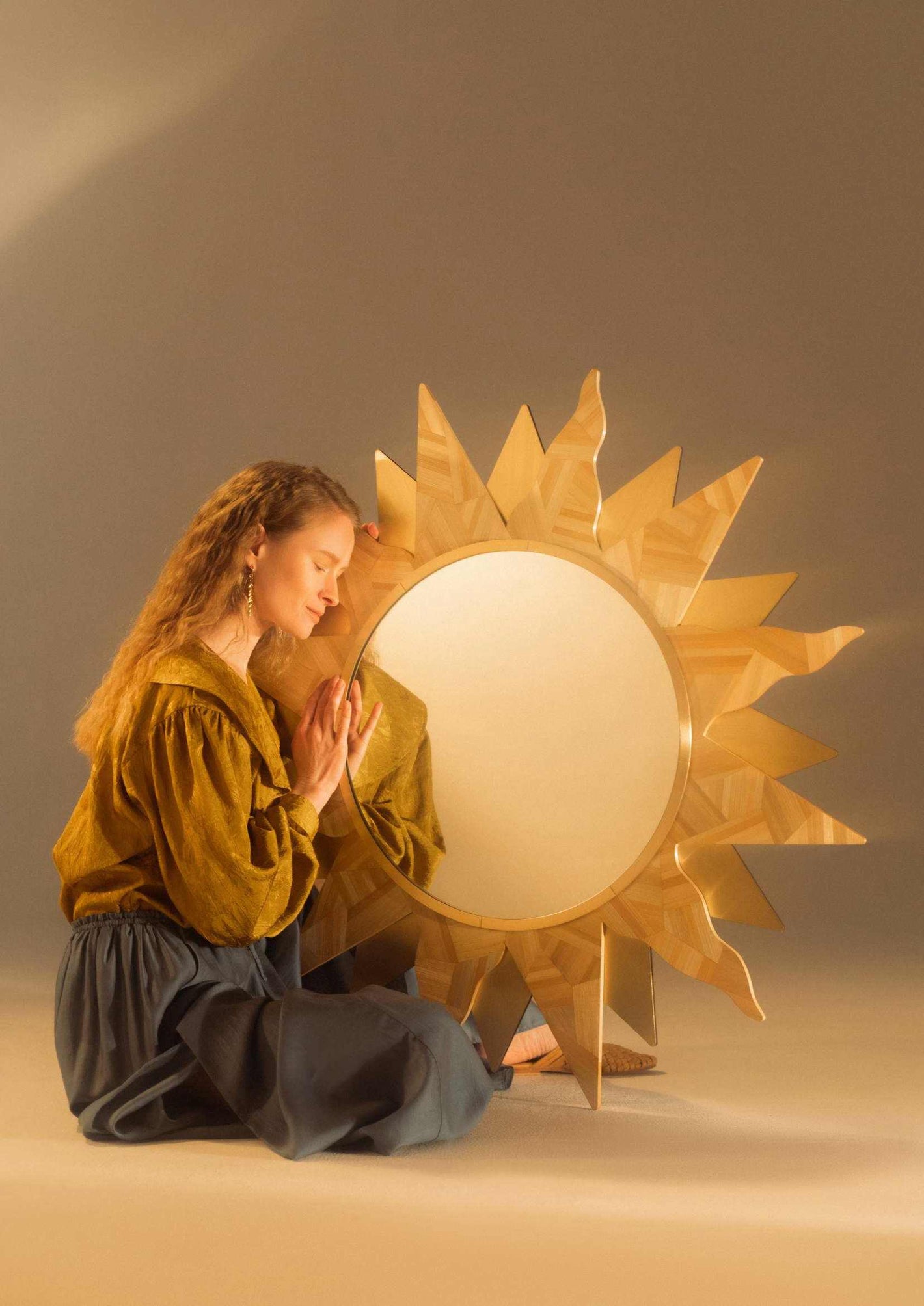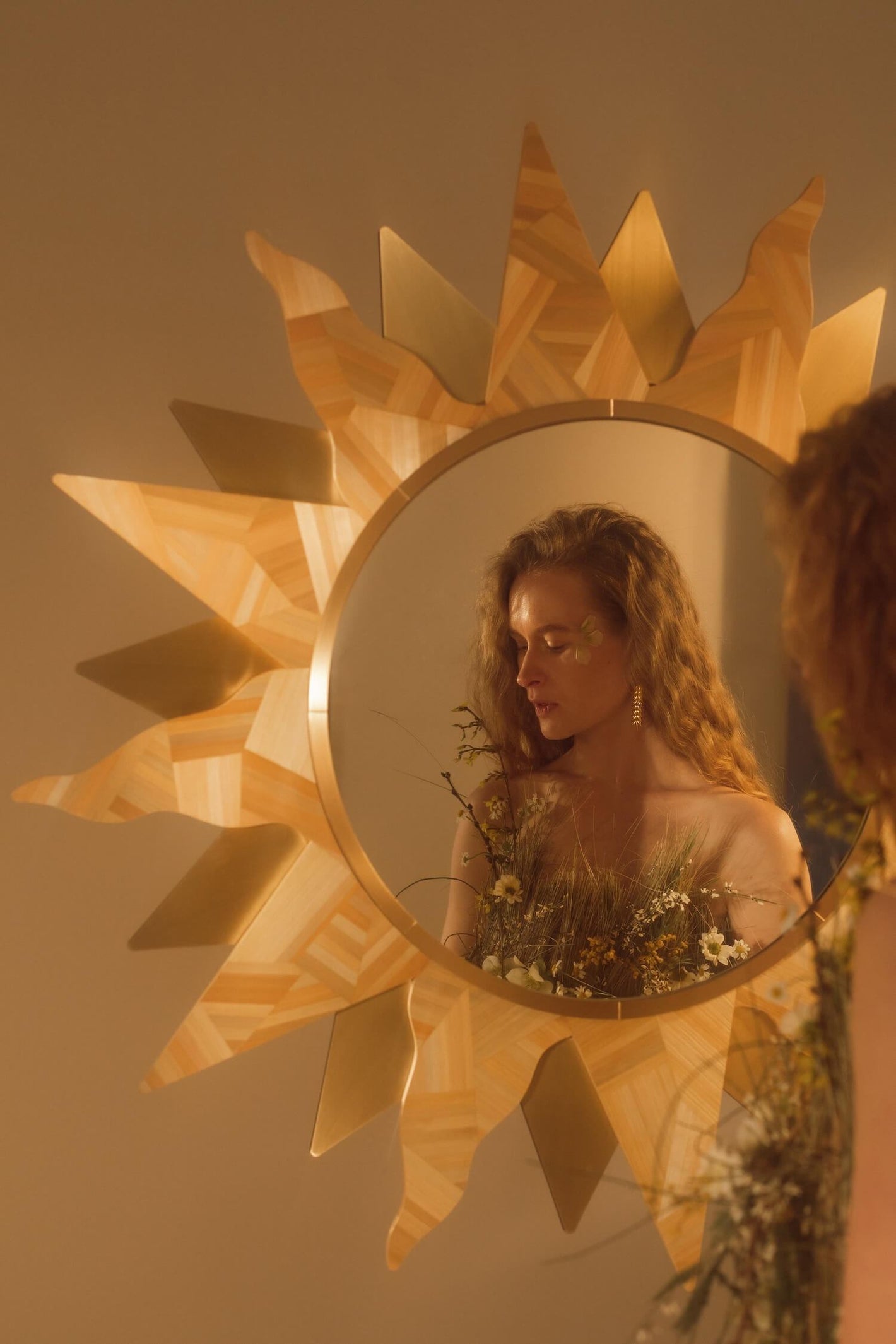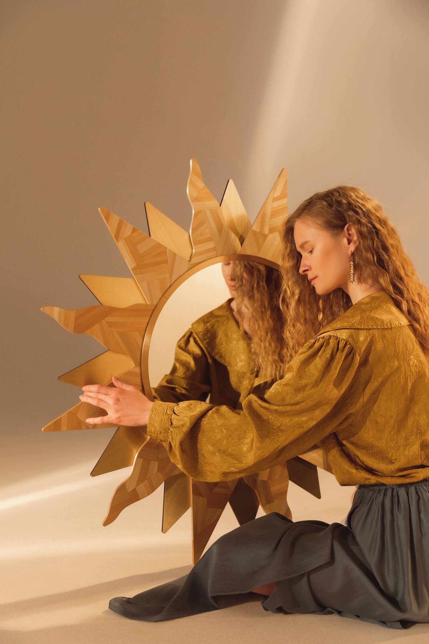 The SUN decorative wall mirror for the living room is a shining amulet designed by the talented Olexandra Rudenko, who was inspired by the beauty of nature and the charm of naive folk art.