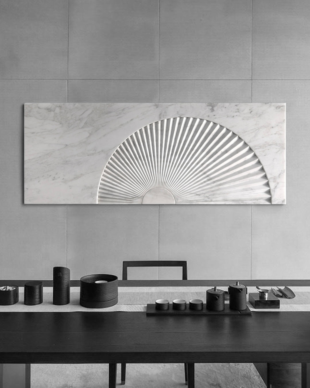 VIYALO 03 Wall Panel artfully brings together two iconic symbols—the fan and marble—to convey the delicate yet resilient nature of the human soul. It's a profound representation of the interplay between fragility and strength, with the robust material standing as a testament to the enduring human spirit.