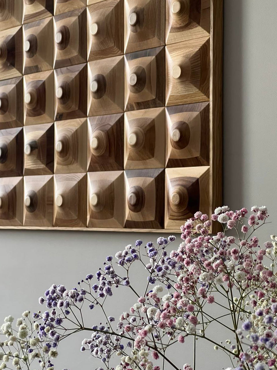 Handcrafted with precision, each panel is a work of art, combining complexity, volume, and rhythm in a mesmerizing optical dance. The rich selection of materials, including walnut, ash, oak, maple, and cherry, allows you to choose the perfect combination that suits your unique style and interior.