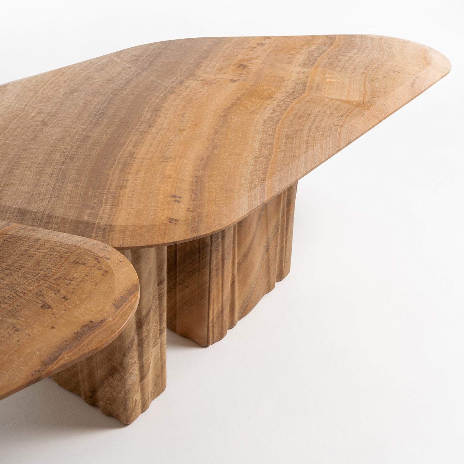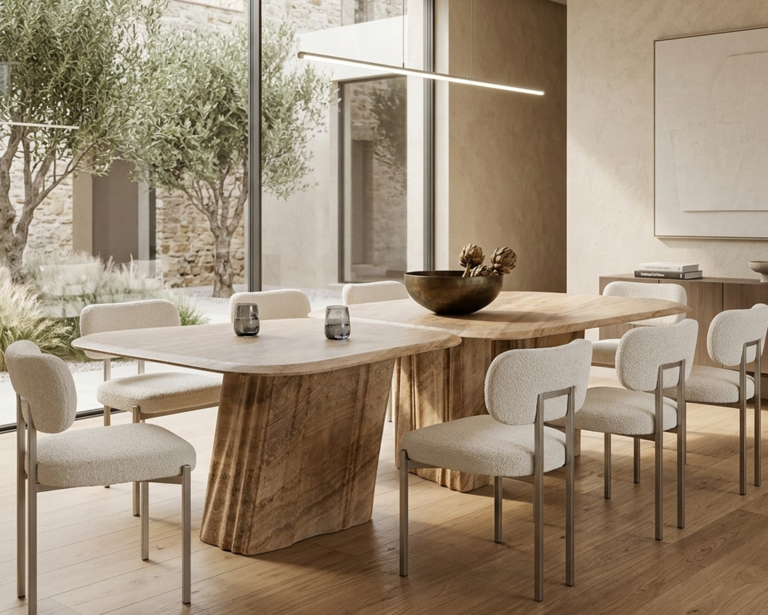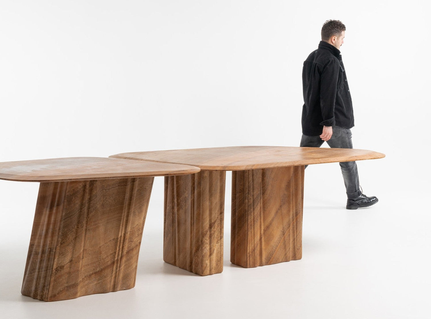 The WAVE 1 Dining Table adapts gracefully to varied architectural spaces and interior scales. Each iteration reveals a unique pattern and texture inherent to the stone chosen, ensuring that no two pieces are ever quite alike.